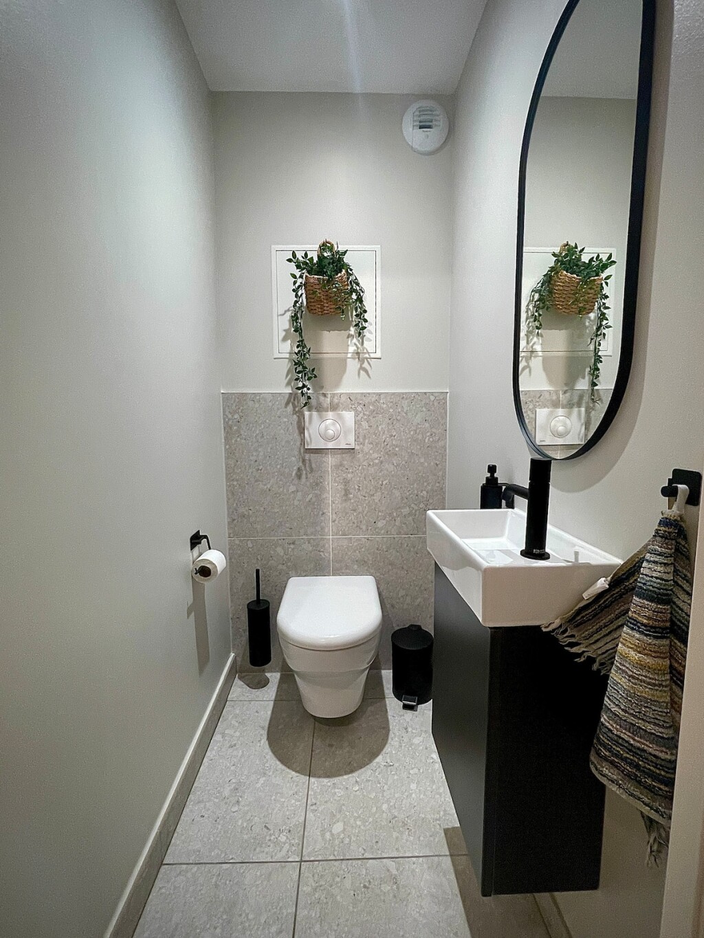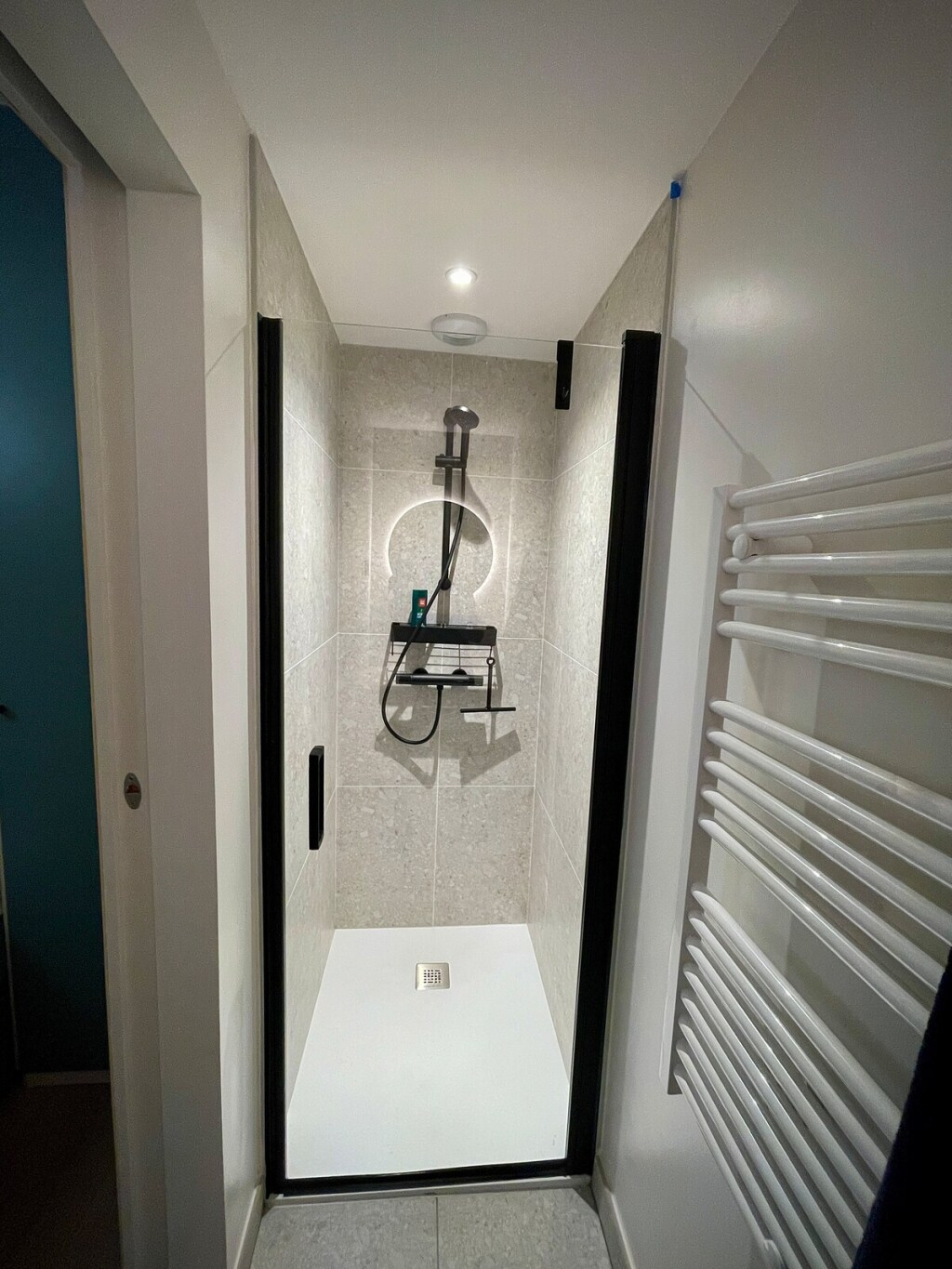 Il y a deux salles de bain, toutes deux équipées d’une douche et d’un lavabo. L’une comprend également des toilettes. Un WC séparé est également à disposition.