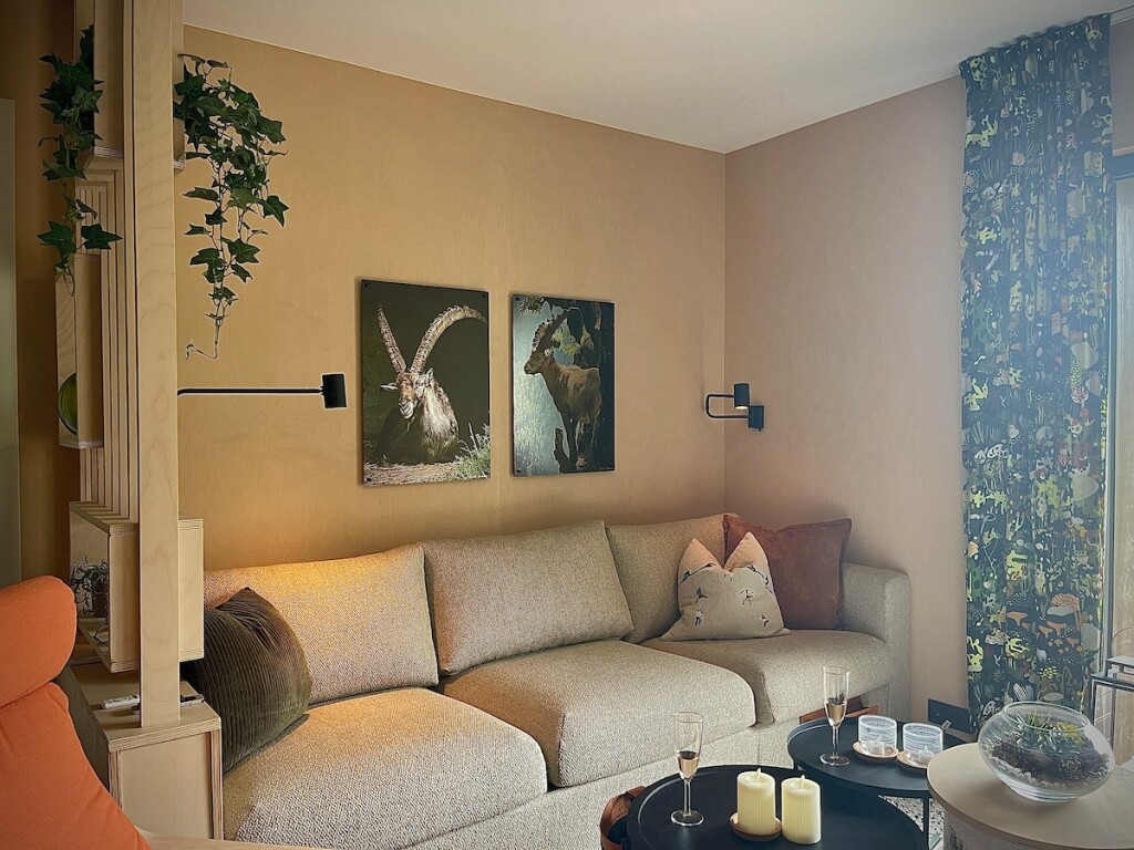 L’appartement dispose de deux chambres spacieuses avec lits doubles et de nombreux rangements. L’une des chambres possède une salle de bain attenante. La seconde, plus grande, offre un accès direct au balcon et bénéficie du soleil du matin. La cuisine entièrement équipée comprend tout ce dont vous avez besoin pour des repas, également un appareil à fondue et un appareil à raclette.