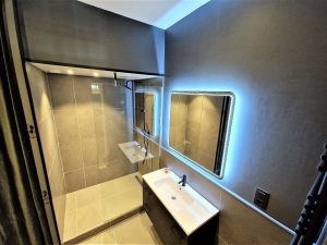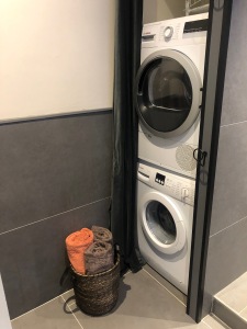 - Salle de bain avec douche à l'italienne, machine à laver et sèche linge