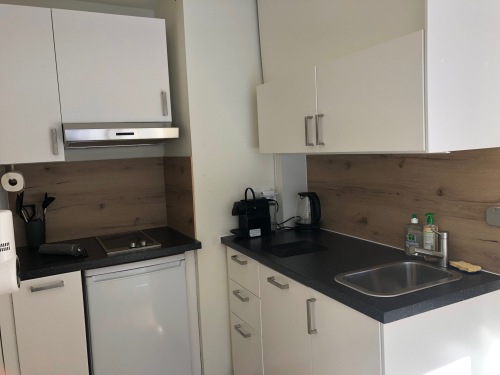 C'est possible de faire à manger pour 4 et profiter d'un repas autour d'une petite table sans devoir sortir tous les soirs. La cuisine est équipée d'un petit four à micro-onde, 2 plaques de cuisson, frigidaire et une lave-vaisselle. Il y a un balcon avec une vue magnifique sur le Mont Blanc et ses Aiguilles.