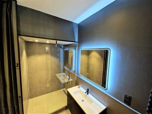 - Salle de bain avec douche à l'italienne, machine à laver et sèche linge